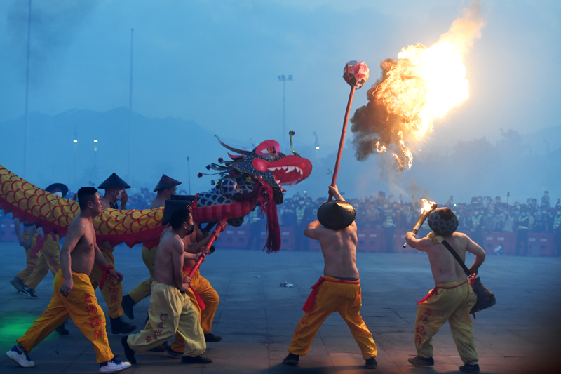 2月27日,在广西宾阳县炮龙文化广场,人们在炮龙节上舞炮龙。 新华社记者 陆波岸 摄