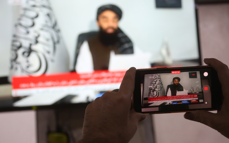 这是2月27日在阿富汗喀布尔拍摄的阿富汗政府发言人穆贾希德在新闻发布会上发言的电视画面。新华社发(塞夫拉赫曼·萨菲摄)