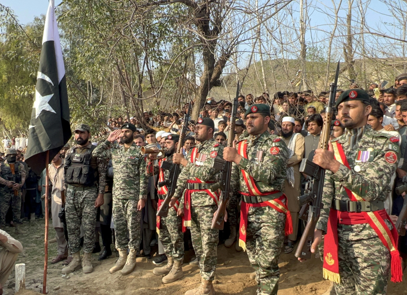 这是2月27日在巴基斯坦西北部开伯尔-普什图省巴贾尔地区拍摄的安全人员葬礼现场(手机照片)。新华社发